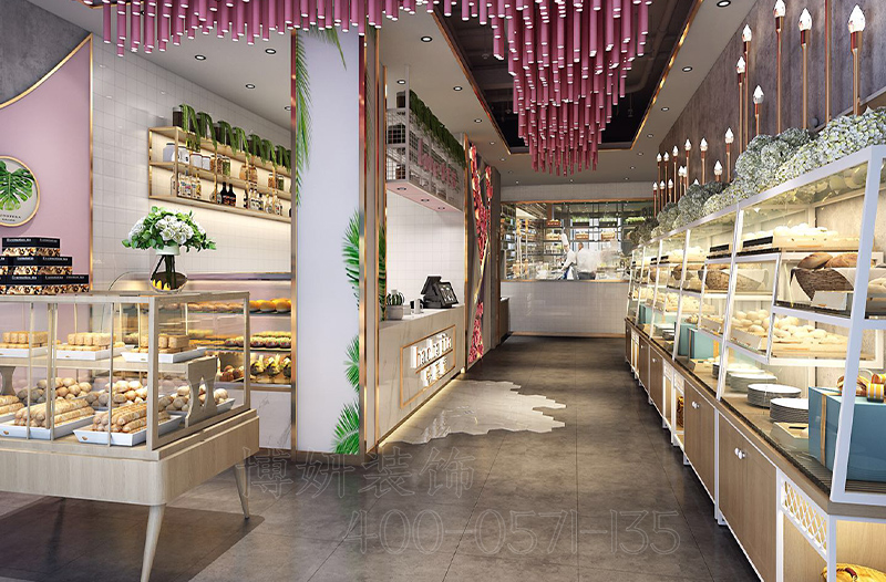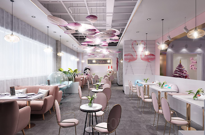 这是一家网红甜品店装修设计效果图,整体色系非常的梦幻,粉色调,但是装修设计把我的恰到好处,不会令人觉得很腻。浅粉红色的沙发,可以给客人提供很舒服的休息,顶部的装饰品也是超级漂亮,将整个店进行了升华。