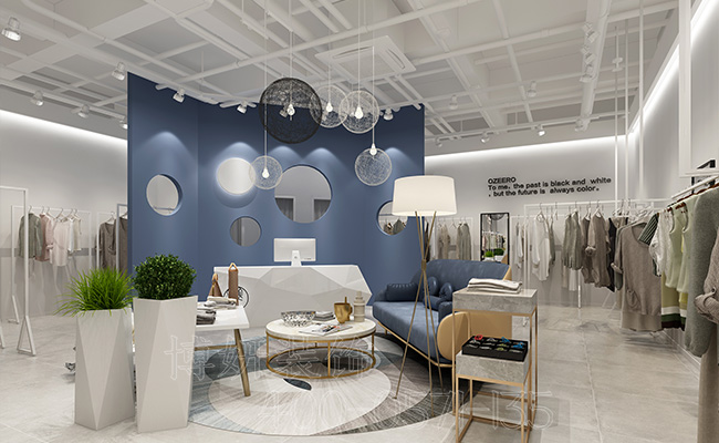 这是一家时尚精美女装店装修设计案例。女装店的装修手法时尚。女装店的中间摆放着一个休息的场所,用蓝色的作为背景,非常的令人舒适、放松。