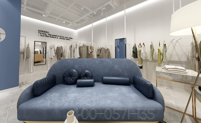 另外一边,女装店内摆放着一张蓝色的大型沙发床,非常的舒适、时尚,可以给顾客超级舒服的体验感。