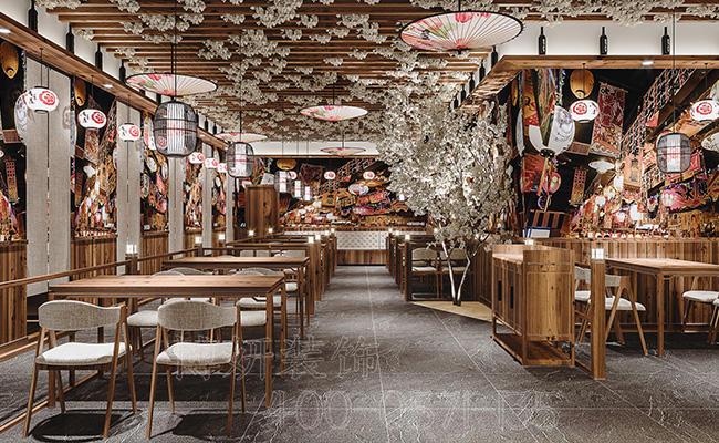 这是一家日料店装修设计效果图。日料店内采用很多的日系元素,餐厅顶部采用很多白色的樱花,中间挂着漂亮的花伞,意境十分漂亮。灯笼装饰也非常的独特,上面带有日式元素的装饰样式,从细节都体现的方方面面。